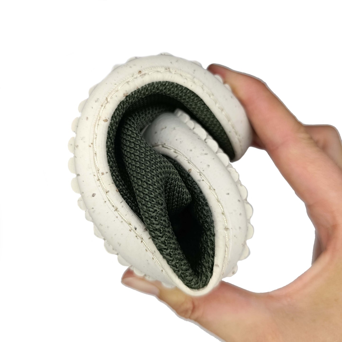 Notre semelle est unique et a nécessité la création de moules spécifiques. En effet, comme elle est sans talon, ni renfort (voûte plantaire), nous avons dû créer nos propres moules afin de respecter nos critères physiologiques. Notre semelle est fine et plate, de même épaisseur sous tout le pied (7mm). Nous avons donc dessiné et déposé notre semelle. nous avons choisi de faire apparaître des alvéoles en dessous pour stimuler les points réflexes du pied et donner plus de flexibilité à la semelle pour lui permettre d'accompagner le déroulé du pied sans contrainte. Large à l'avant, elle respecte la morphologie du pied et permet aux orteils de retrouver leur liberté améliorant ainsi la proprioception. Elle est composée de 70% de caoutchouc naturel recyclé (anciennes semelles) et de 30% de caoutchouc naturel neuf, c'est la proportion idéale pour garantir la solidité de la semelle. Et pour sensibiliser au recyclage, nous avons choisi d'incorporer du marc de café récupéré chez des restaurateurs ou des chutes de liège, déchets de l'industrie portugaise.