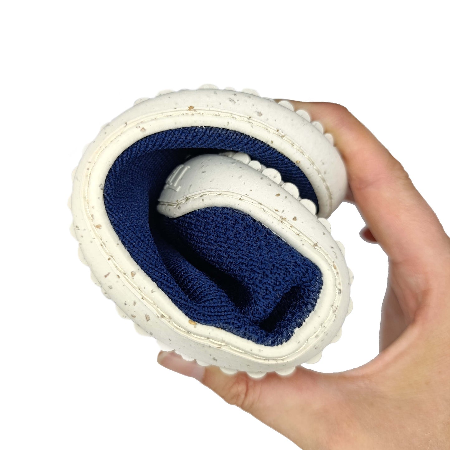 Notre semelle est unique et a nécessité la création de moules spécifiques. En effet, comme elle est sans talon, ni renfort (voûte plantaire), nous avons dû créer nos propres moules afin de respecter nos critères physiologiques. Notre semelle est fine et plate, de même épaisseur sous tout le pied (7mm). Nous avons donc dessiné et déposé notre semelle. nous avons choisi de faire apparaître des alvéoles en dessous pour stimuler les points réflexes du pied et donner plus de flexibilité à la semelle pour lui permettre d'accompagner le déroulé du pied sans contrainte. Large à l'avant, elle respecte la morphologie du pied et permet aux orteils de retrouver leur liberté améliorant ainsi la proprioception. Elle est composée de 70% de caoutchouc naturel recyclé (anciennes semelles) et de 30% de caoutchouc naturel neuf, c'est la proportion idéale pour garantir la solidité de la semelle. Et pour sensibiliser au recyclage, nous avons choisi d'incorporer du marc de café récupéré chez des restaurateurs ou des chutes de liège, déchets de l'industrie portugaise.