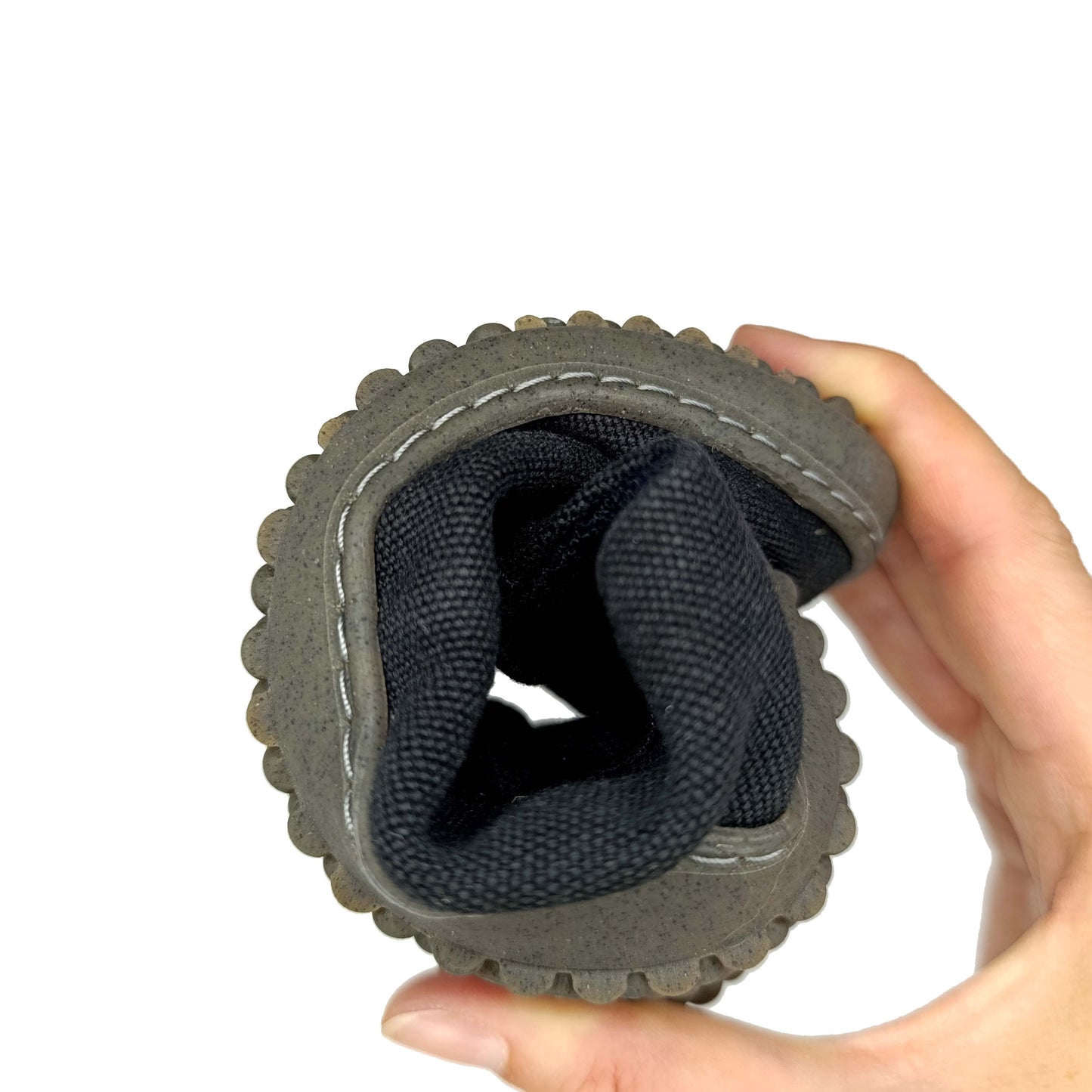Notre semelle est unique et a nécessité la création de moules spécifiques. En effet, comme elle est sans talon, ni renfort (voûte plantaire), nous avons dû créer nos propres moules afin de respecter nos critères physiologiques. Notre semelle est fine et plate, de même épaisseur sous tout le pied (7mm). Nous avons donc dessiné et déposé notre semelle. nous avons choisi de faire apparaître des alvéoles en dessous pour stimuler les points réflexes du pied et donner plus de flexibilité à la semelle pour lui permettre d'accompagner le déroulé du pied sans contrainte. Large à l'avant, elle respecte la morphologie du pied et permet aux orteils de retrouver leur liberté améliorant ainsi la proprioception. Elle est composée de 70% de caoutchouc naturel recyclé (anciennes semelles) et de 30% de caoutchouc naturel neuf, c'est la proportion idéale pour garantir la solidité de la semelle. Et pour sensibiliser au recyclage, nous avons choisi d'incorporer du marc de café récupéré chez des restaurateurs ou des chutes de liège, déchets de l'industrie portugaise.