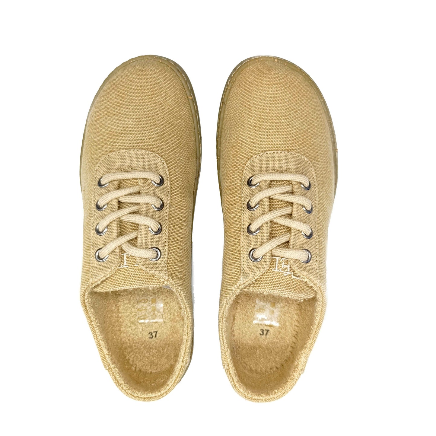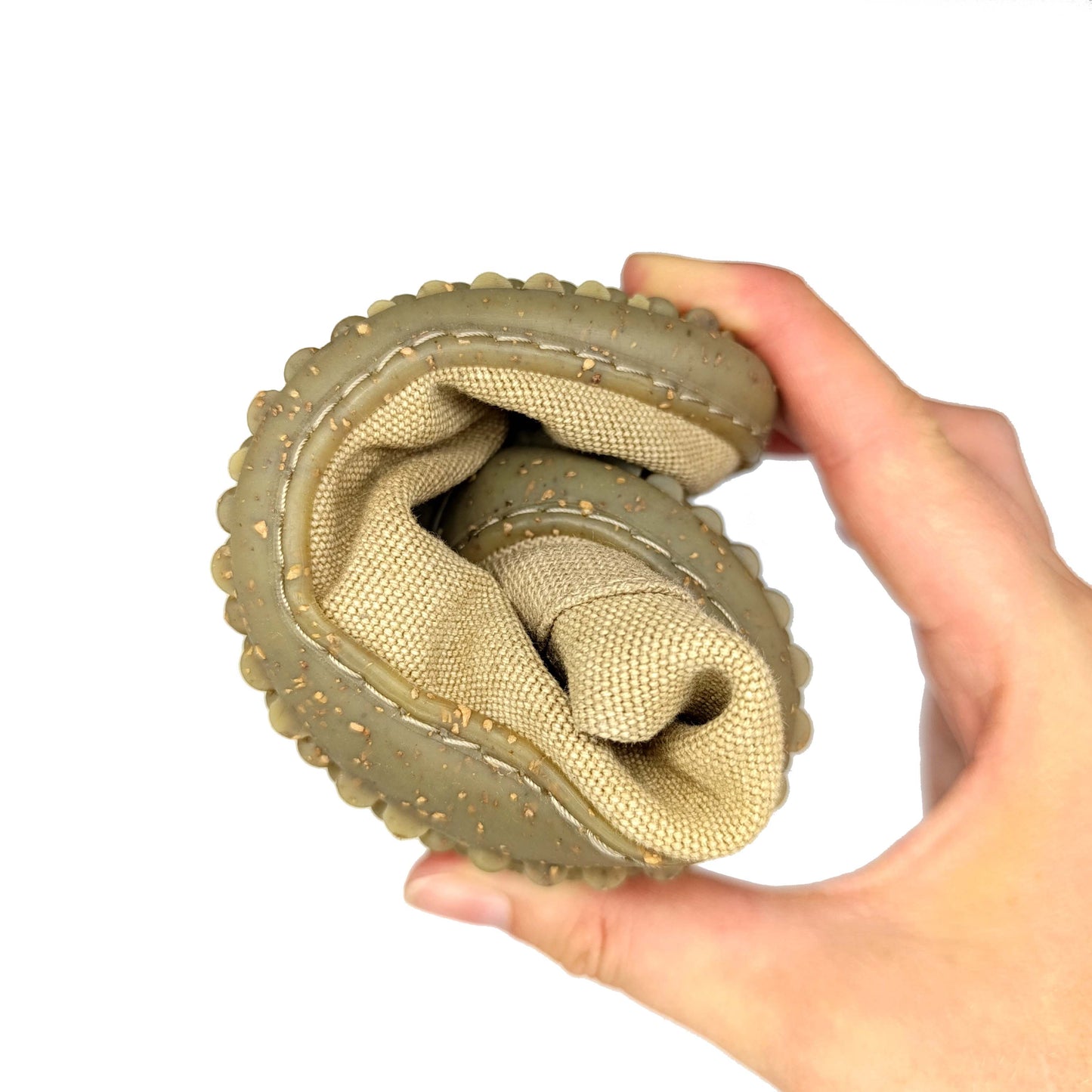 Notre semelle est unique et a nécessité la création de moules spécifiques. En effet, comme elle est sans talon, ni renfort (voûte plantaire), nous avons dû créer nos propres moules afin de respecter nos critères physiologiques. Notre semelle est fine et plate, de même épaisseur sous tout le pied (7mm). Nous avons donc dessiné et déposé notre semelle. nous avons choisi de faire apparaître des alvéoles en dessous pour stimuler les points réflexes du pied et donner plus de flexibilité à la semelle pour lui permettre d'accompagner le déroulé du pied sans contrainte. Large à l'avant, elle respecte la morphologie du pied et permet aux orteils de retrouver leur liberté améliorant ainsi la proprioception. Elle est composée de 70% de caoutchouc naturel recyclé (anciennes semelles) et de 30% de caoutchouc naturel neuf, c'est la proportion idéale pour garantir la solidité de la semelle. Et pour sensibiliser au recyclage, nous avons choisi d'incorporer du marc de café récupéré chez des restaurateurs ou des chutes de liège, déchets de l'industrie portugaise.
