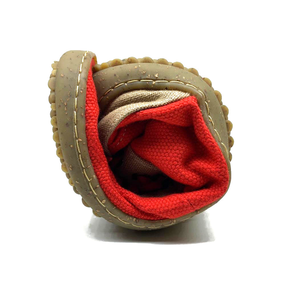 Notre semelle est unique et a nécessité la création de moules spécifiques. En effet, comme elle est sans talon, ni renfort (voûte plantaire), nous avons dû créer nos propres moules afin de respecter nos critères physiologiques. Notre semelle est fine et plate, de même épaisseur sous tout le pied (7mm). Nous avons donc dessiné et déposé notre semelle. nous avons choisi de faire apparaître des alvéoles en dessous pour stimuler les points réflexes du pied et donner plus de flexibilité à la semelle pour lui permettre d'accompagner le déroulé du pied sans contrainte. Large à l'avant, elle respecte la morphologie du pied et permet aux orteils de retrouver leur liberté améliorant ainsi la proprioception. Elle est composée de 70% de caoutchouc naturel recyclé (anciennes semelles) et de 30% de caoutchouc naturel neuf, c'est la proportion idéale pour garantir la solidité de la semelle. Et pour sensibiliser au recyclage, nous avons choisi d'incorporer du marc de café récupéré chez des restaurateurs ou des chutes de liège, déchets de l'industrie portugaise.