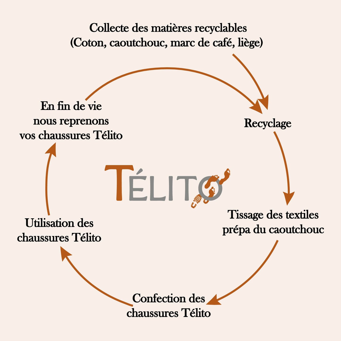 Une fois usées, nous reprenons vos Télito pour les recycler. Elles serrons intégralement broyées et injectées dans le caoutchouc des semelles des futures collections.