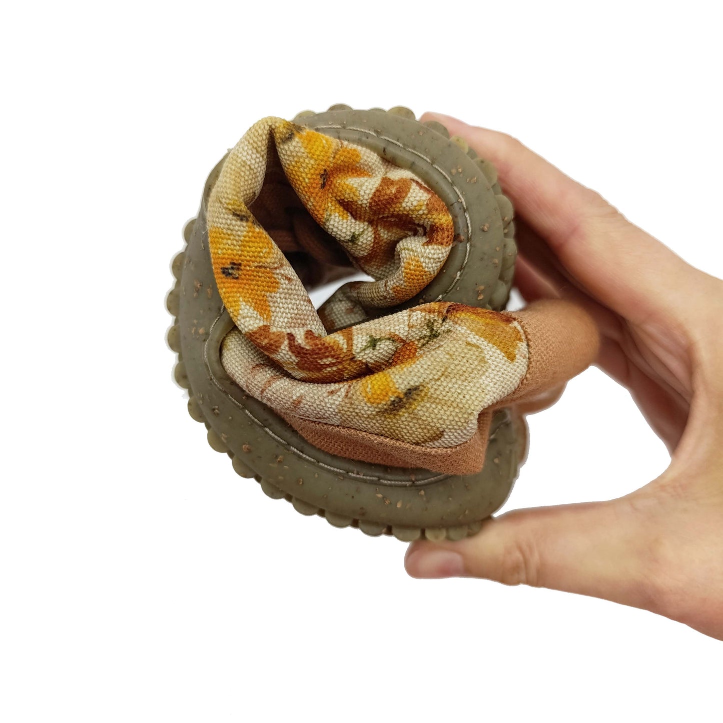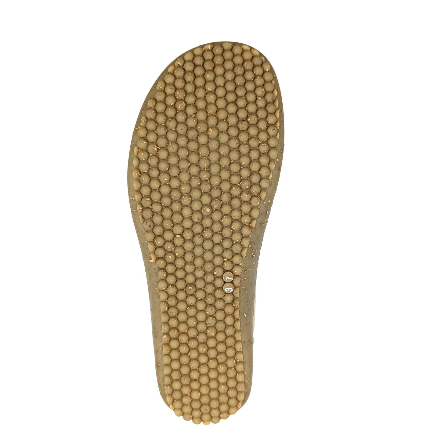 Notre semelle est unique et a nécessité la création de moules spécifiques. En effet, comme elle est sans talon, ni renfort (voûte plantaire), nous avons dû créer nos propres moules afin de respecter nos critères physiologiques. Notre semelle est fine et plate, de même épaisseur sous tout le pied (7mm). Nous avons donc dessiné et déposé notre semelle. nous avons choisi de faire apparaître des alvéoles en dessous pour stimuler les points réflexes du pied et donner plus de flexibilité à la semelle pour lui permettre d'accompagner le déroulé du pied sans contrainte. Large à l'avant, elle respecte la morphologie du pied et permet aux orteils de retrouver leur liberté améliorant ainsi la proprioception. Elle est composée de 70% de caoutchouc naturel recyclé (anciennes semelles) et de 30% de caoutchouc naturel neuf, c'est la proportion idéale pour garantir la solidité de la semelle. Et pour sensibiliser au recyclage, nous avons choisi d'incorporer du marc de café récupéré chez des restaurateurs ou des chutes de liège, déchets de l'industrie portugaise.